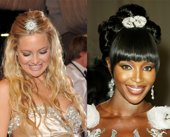 Acessórios – O acessório de cabelo substitui uma joia usada no corpo. Kate Hudson e Naomi Campbell escolheram uma joia delicada de brilhantes para usar no centro da cabeça. Kate com estilo mais hippie e cabelos soltos e franja levemente presa, Naomi elaborou o modelo do coque, franja cheia e super lisa para receber a joia.