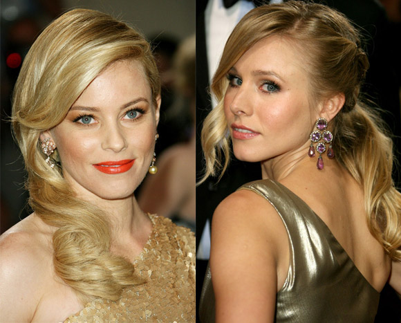 Volume e preso – O cabelo volumosos também é glamuroso quando preso em um rabo de cavalo baixo. Elizabeth Banks puxou o comprimento do cabelo todo para a lateral, e manteve as ondas. Kristen Bell criou um rolinho na lateral para somar com os cachos do cabelo preso em um ravo de cavalo.