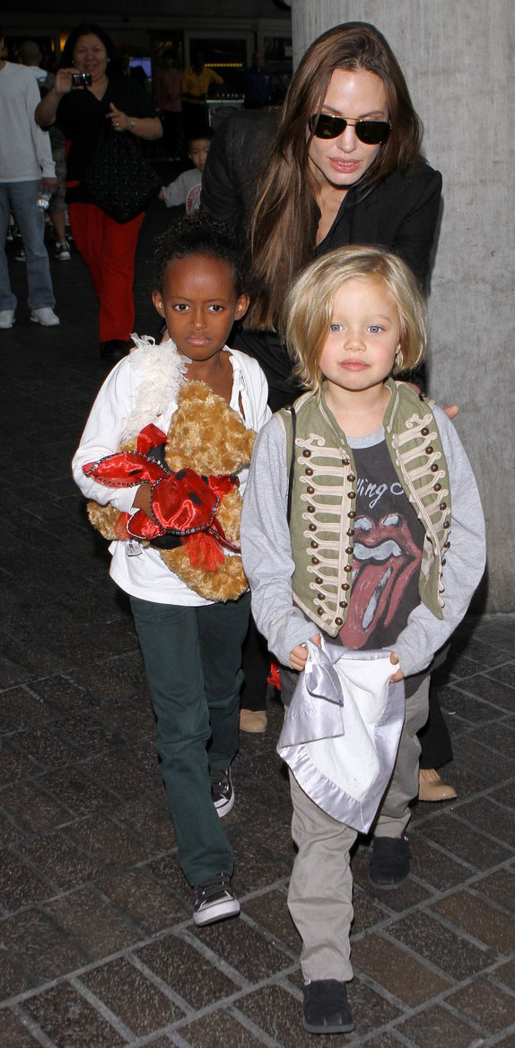 Todos nos sabemos que a Angelina é bem rock m' roll, em fotos dela a alguns aninhos atrás ela demostra muito isso, só que para manter a sua imagem (eu pelo menos acho isso) ela não usa essas roupitxas, então quem foi que ficou com o titulo de roqueira da casa? quem, quem, quem?! Claro, a Shiloh!!! A Princesinha da casa dos Jolie-Pitt tem um closet bem masculino, algumas coisas bem roqueira, eu confesso que acho bem estranho, mas ontem para mim a linda pequena arrazouuuuuuu. Ela comemorou o dia do rock ontem, com uma camisa do Rolling Stones, que todos aqui sabem que é o meu sonho...
