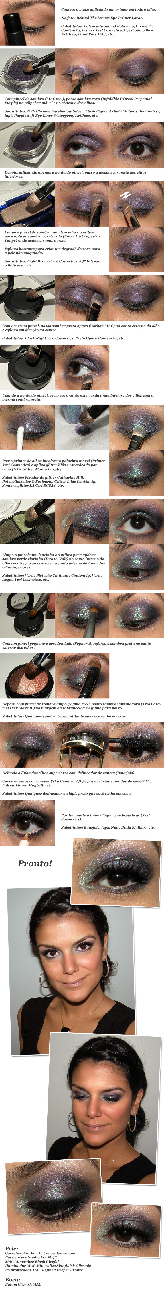 O Tutorial de hoje mistura roxo e verde com uma pitada de glitter. Bem legal pra quem está mais animada pra badalar cheia de brilhos neste final de semana, né!!